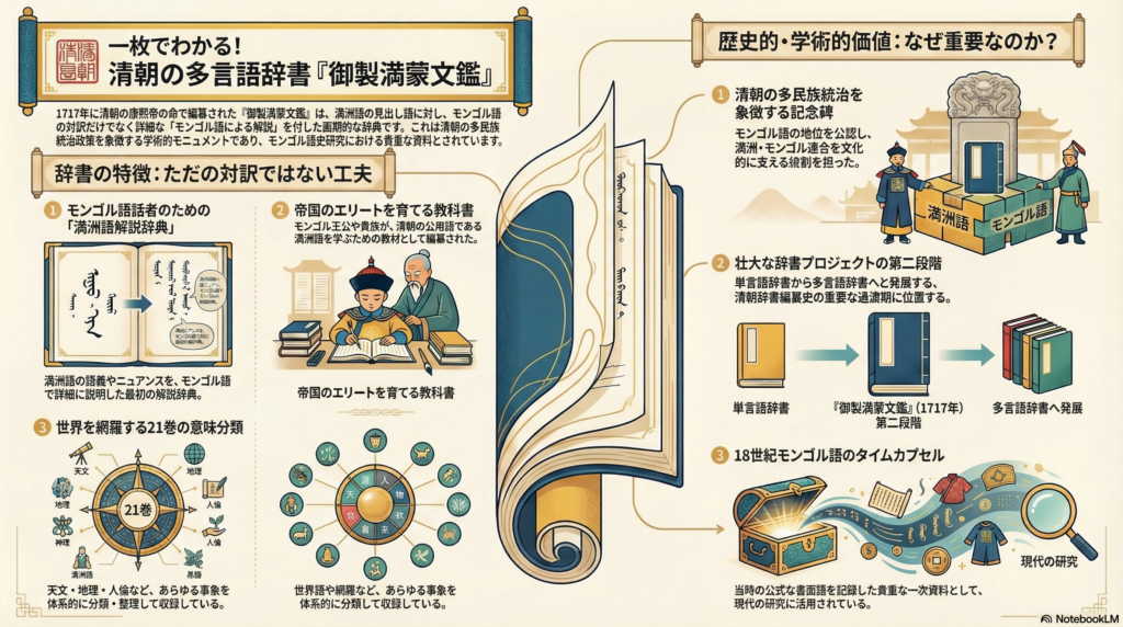 本辞典は、清朝が「モンゴル語」を重視した証拠である。満洲語を「国語」と定めつつ、モンゴル語話者のために解説辞典を編纂したことは、モンゴル貴族・王公の政治的重要性を反映する。