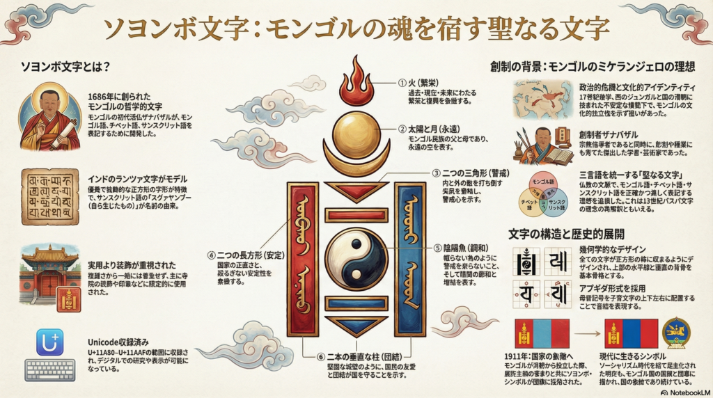 文字名の「ソヨンボ」はサンスクリット語の Svayambhu (自生者、自ら存在する者)のモンゴル語訛りである。ザナバザルは、モンゴル語・チベット語・サンスクリット語の三言語を正確かつ美しく表記できる「聖なる文字」を構想した。これは、13世紀のパスパ文字(フビライ・カーン制定)の「多言語統一文字」という理想を、仏教的な文脈で再解釈した試みとも言える。